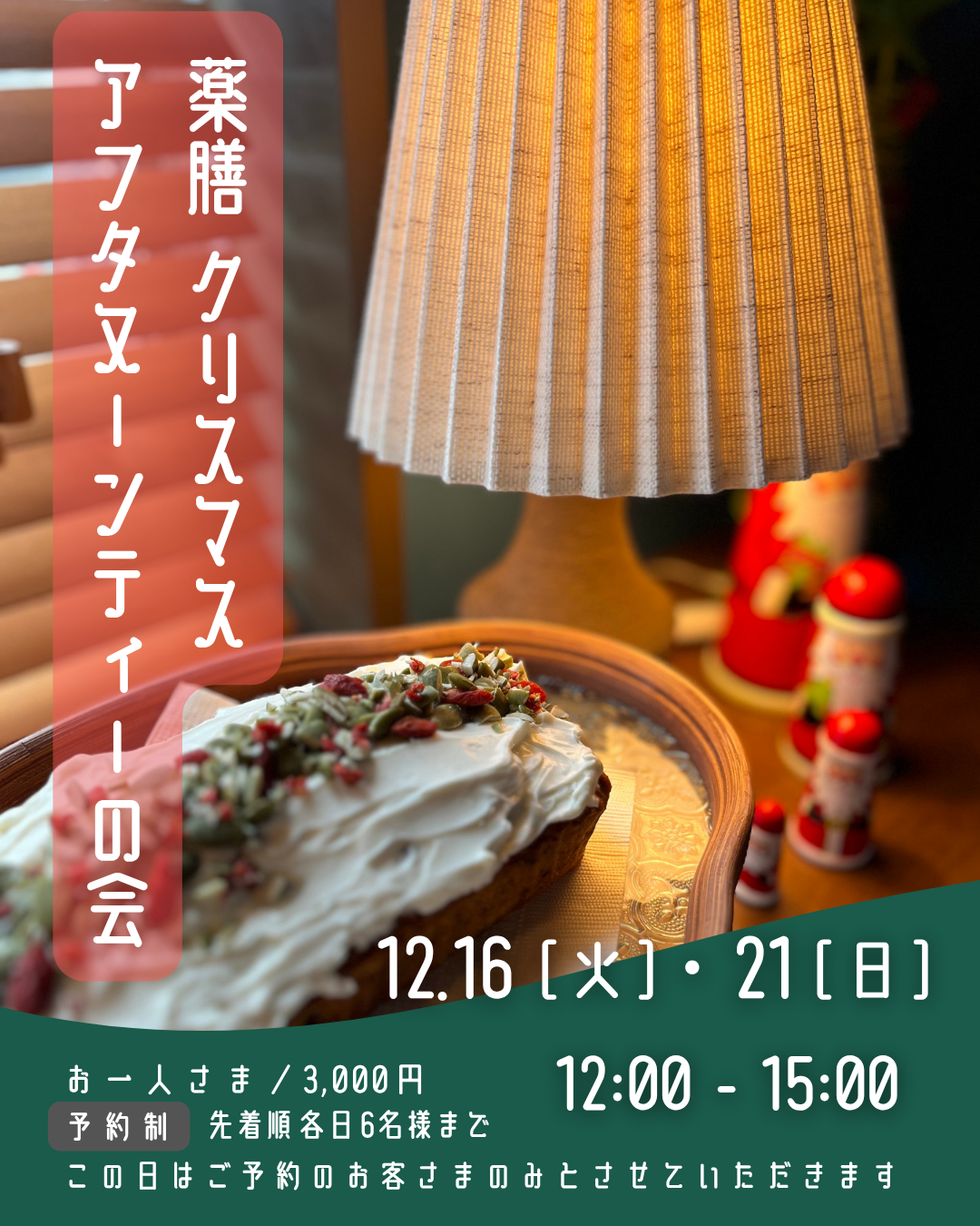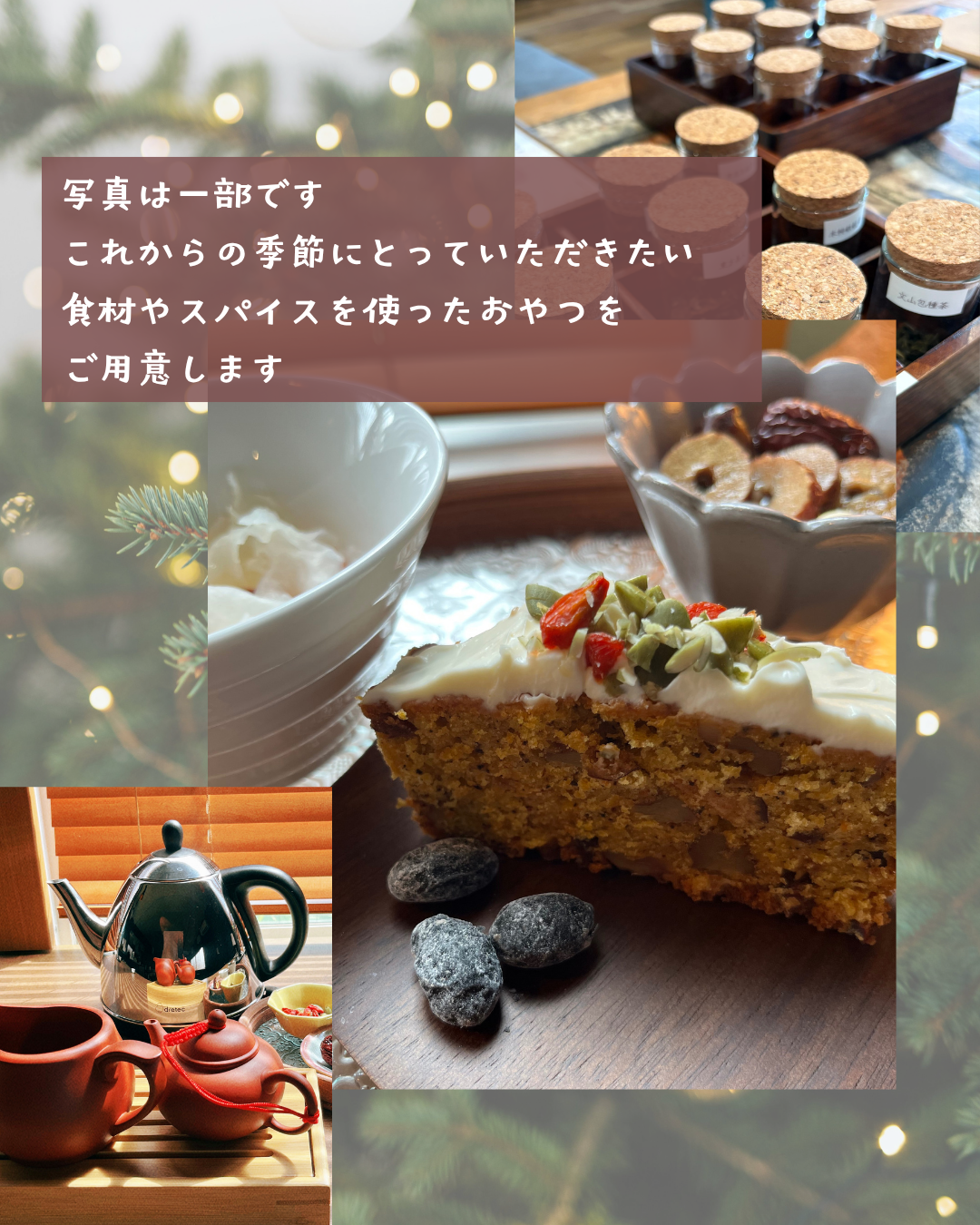 薬膳クリスマス!アフタヌーンティーの会お砂糖、小麦粉をなるべく控え、この季節にとってほしい食材やスパイスを使ったおやつを考えました!