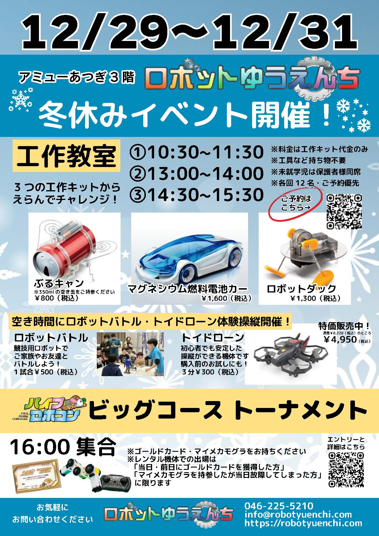 あつぎロボットゆうえんち 12/29~12/31★冬休みイベント 2025年12月14日 工作教室ご予約受付中! ロボットバトル・トイドローン体験操縦・パイプロボコンも! ぜひあそびにきてください。 詳しくはこちら 工作教室ご予約