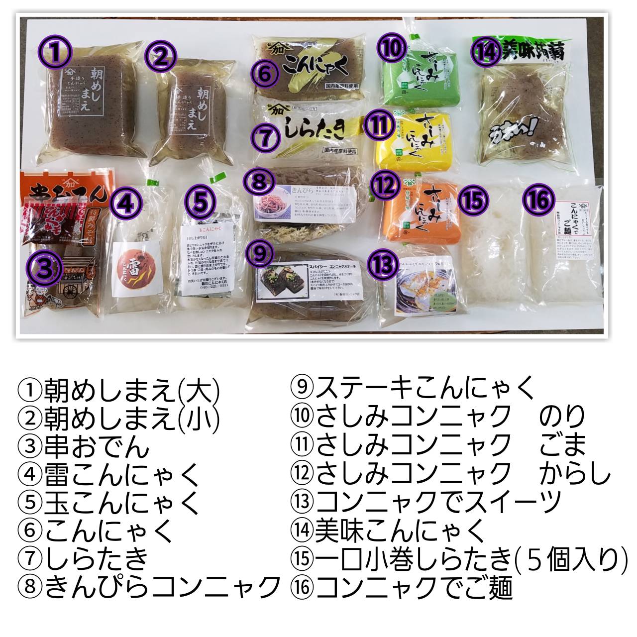 看板商品の朝めし前コンニャクを始め季節に応じたオススメ商品を御用意しております。月に1度、毎月第4水曜日には出来立てコンニャクを販売しています。また御中元や御歳暮、お年賀手土産にギフト包装のご用意もございますので地方発送も承っております。
